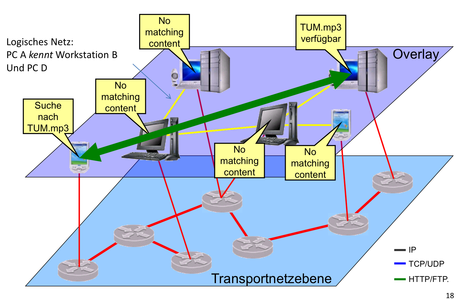 - Aufgabe: Vernetzung von Rechern auf logische Ebene, um den direkten(Peer-to-Peer) Austasuch von Dateien zu erleichtern.