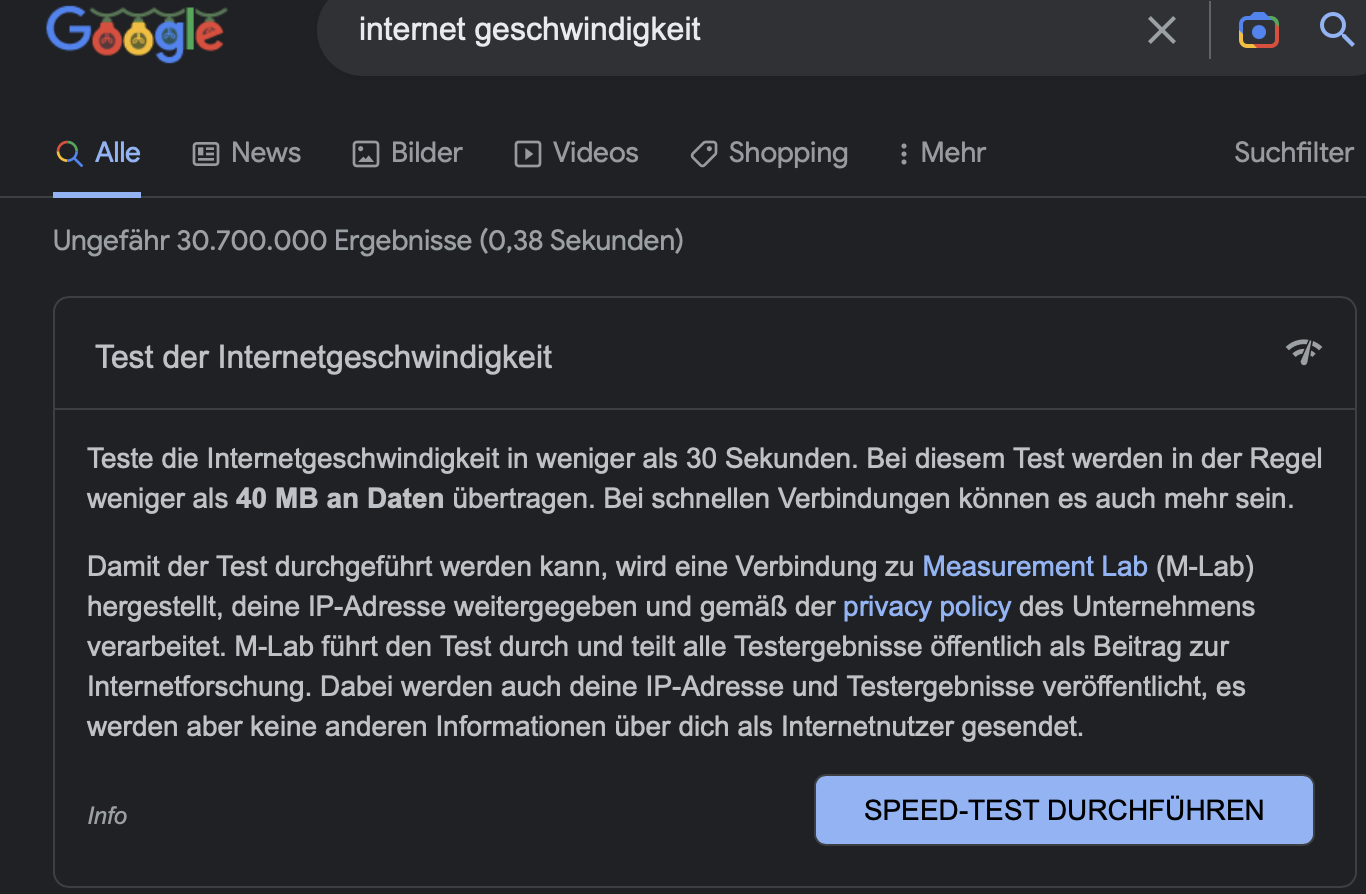 - Datenrate: abhängig von Zugangsnetz : Man kann die Geschwindigkeit einfach testen
