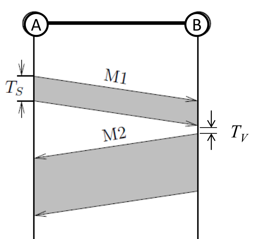 1. Nachrichtensendedauer \( T_s \) 2. Kanallaufzeit \( T_p \) 3. Verzögerungszeit im Knoten \( T_v \) - Zwei direkt benachbarte Netzknoten (Single Hop) |