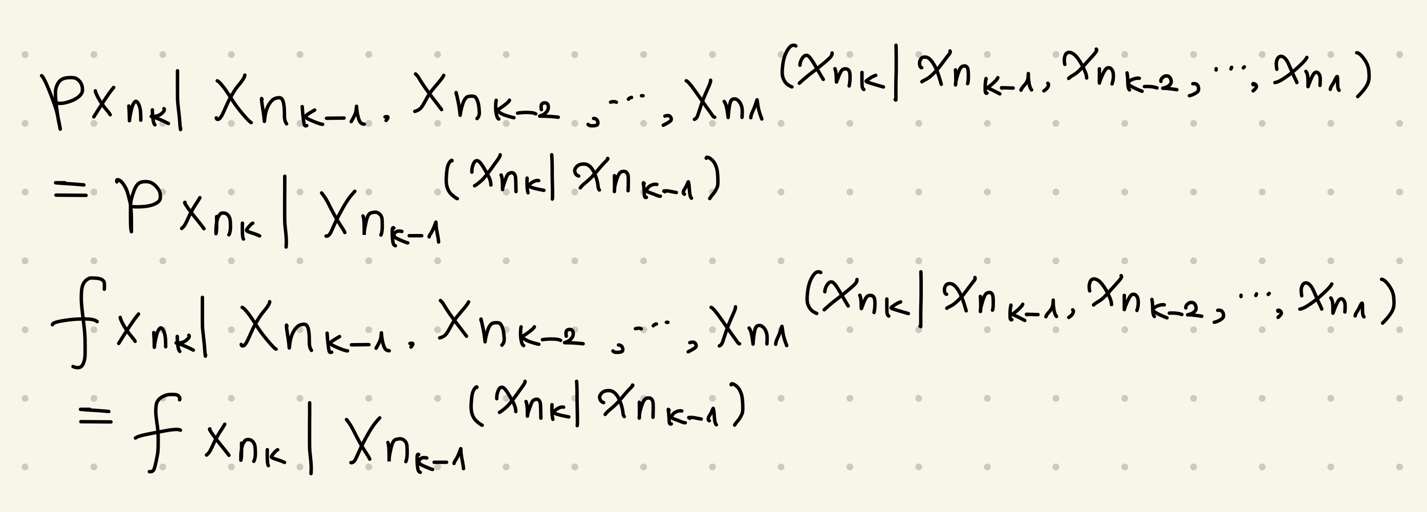 Zusätzlich Kenntnis der gesamten Vorgeschichte \( X_1, ..., X_{n-2}\) der Zufallsfolge bringt keine zusätzliche Kenntnis über \(X_n\)