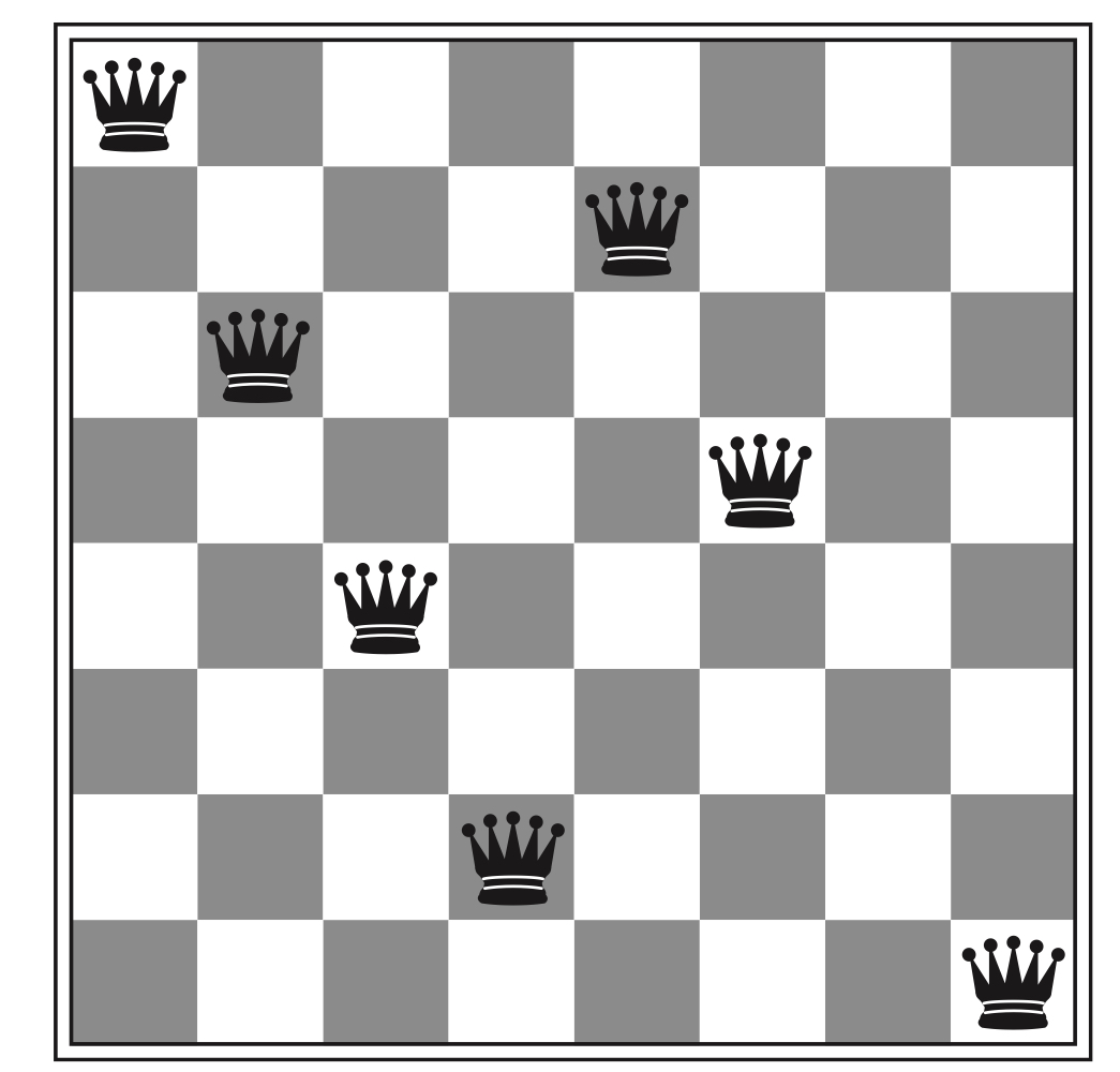 - Place 8 queens on a chessboard such that no queens attack each other. A queen attacks any piece in the same row, column or diagonal